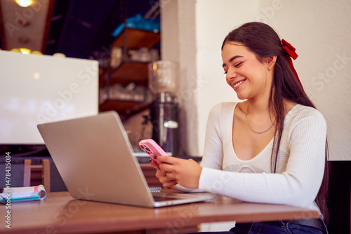 Smiling student using laptop and smartphone in cafe, enjoying online learning and communication