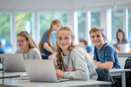Smiling students engaging with laptops in a bright and modern classroom, embracing technology and collaborative learning