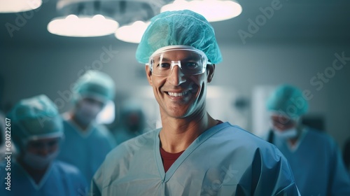 Smiling surgeon man in surgical operating room, talented doctor surgeon successfully performed complex surgery on patient, happy smiling man in a medical coat and cap, generative AI