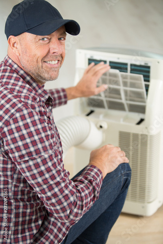 smiling technician fixing electric device
