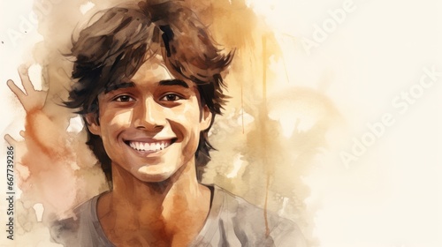 Smiling Teen Indian Man with Brown Straight Hair Watercolor Illustration. Portrait of Casual Person on white background with copy space. Photorealistic Ai Generated Horizontal Illustration.