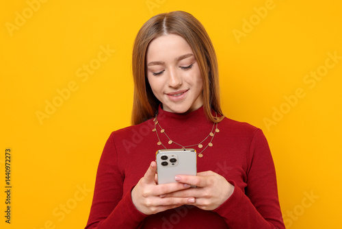 Smiling teenage girl with smartphone on yellow background