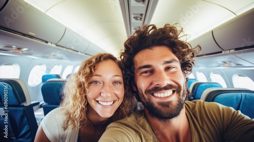 Smiling Tourists Snapping Selfies In The Plane. Happy Young Couple Embarking On A Summer Vacation Adventure. Holidays And Transportation Concept. Generative AI