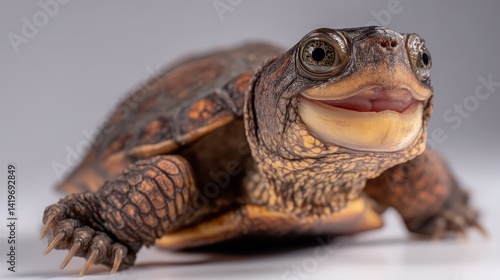 Smiling turtle closeup, a heartwarming portrait of cheerful reptile in its natural habitat