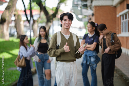 Smiling university student gives a thumbs-up while holding notebooks on a vibrant college campus.