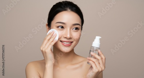 Smiling woman applies skincare product with cotton pad in studio setting.