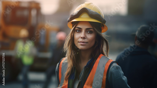 Smiling Woman at Construction Site, Wearing Hard Hat and Work Vest