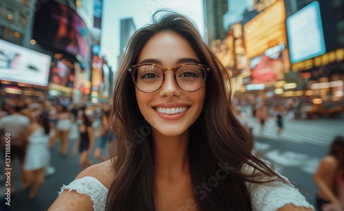 Smiling Woman Captures Joyful Selfie in Vibrant Times Square During Summer Afternoon