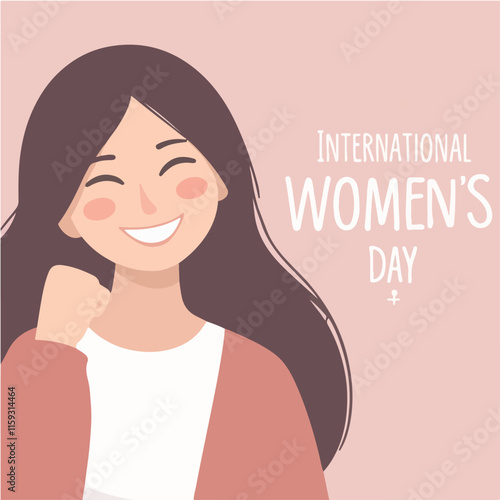 Smiling woman fist raised, celebrating International Womens Day. Suitable for publications, social media, and editorial content promoting female empowerment.