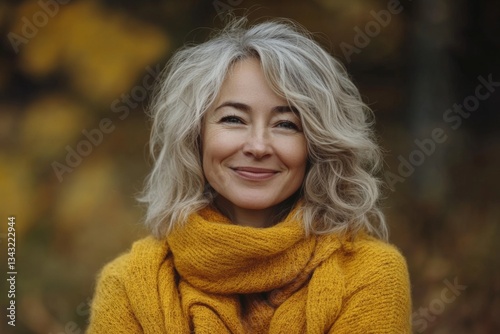 Smiling woman in cozy sweater poses outdoors surrounded by autumn foliage in a serene atmosphere