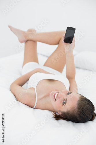 Smiling woman in nightwear with mobile phone in bed