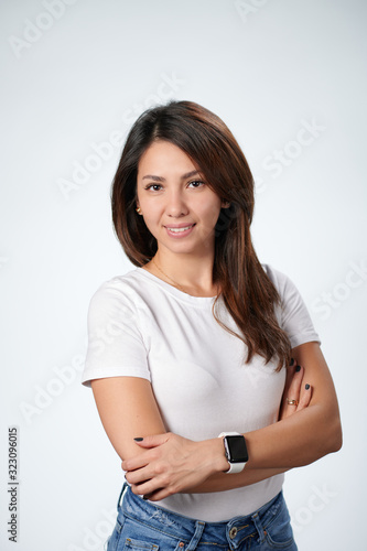 Smiling woman in white T-short standing with arms crossed, white bachground