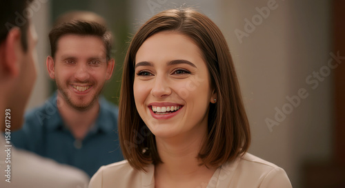 Smiling woman listens attentively, happy colleagues in background, professional meeting.