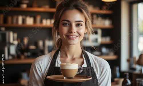 Smiling woman serving coffee in cafe