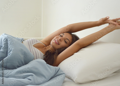 Smiling woman stretching in bed after wake up