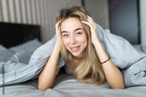 Smiling woman under a duvet in her bedroom. Closeup portrait of a beautiful young woman under the blanket. happy good morning