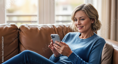 Smiling Woman Using Smartphone While Relaxing on Comfortable Sofa at Home