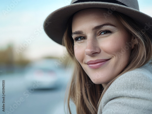 Smiling woman wearing a hat relaxing outdoors on a sunny day