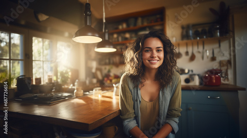 smiling woman with coffee in cozy, well-equipped kitchen