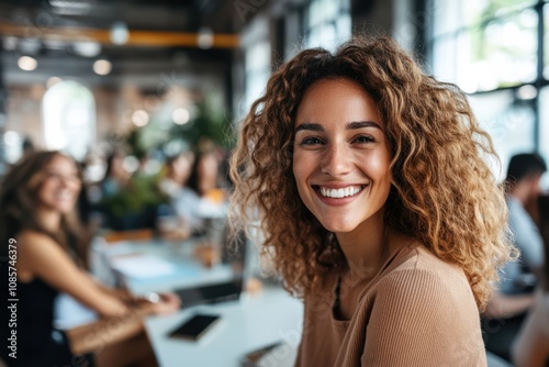 Smiling woman with curly hair enjoys a lively meeting in a bright office during the day with colleagues engaged in discussions