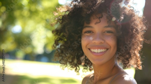 Smiling Woman with Curly Hair in a Summery Portrait