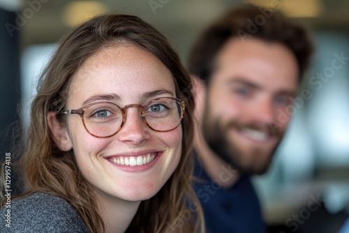 Smiling Woman with Glasses and a Blurred Man in the Background