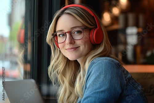 Smiling woman with headphones and glasses near a window