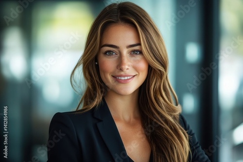 Smiling woman with long brown hair wearing a dark jacket indoors.
