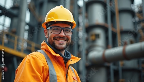 Smiling worker poses, safety gear in front of industrial backdrop. Man wearing hard hat, glasses, work uniform. Refinery or factory background. Engineering, industry, construction.