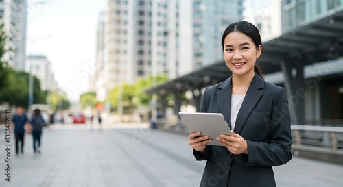 Smiling young Asian business woman leader entrepreneur, professional manager holding digital tablet standing on the street in big city on sky background.