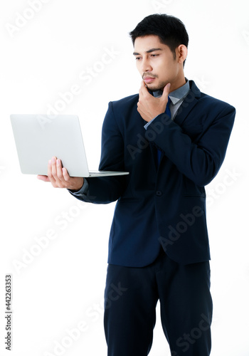 Smiling young Asian businessman shows laptop on isolated white background. Studio shot, business and success concept.