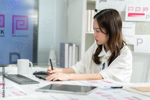 Smiling Young asian Designer Working design logo brand on Tablet in Bright Modern Office Space,Surrounded by branding designs.Asian Designer Woman Taking Business Call at Creative Office Desk