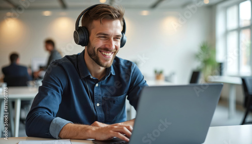 Smiling young bearded man wears headphones. Uses laptop, types, watches screen in modern bright office. Guy enjoys online meeting, remote work, e-learning, video call, digital communication. Worker