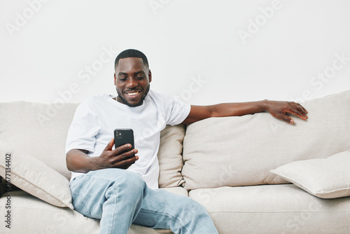 Smiling young Black man relaxing on a couch while using a smartphone, dressed casually in a white t shirt and light blue jeans, vibrant and friendly atmosphere