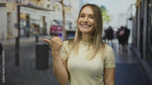 Smiling young blonde woman points thumb on a bustling city street indicating direction in an outdoor urban setting