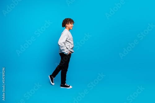 Smiling young boy walking confidently with casual outfit against vibrant blue background for educational and student themes
