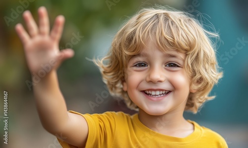 Smiling young boy with curly blonde hair waving cheerfully outdoors