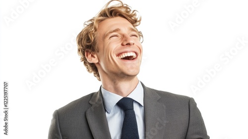 Smiling young businessman in suit displaying joy against a white background, exemplifying professionalism and positivity in corporate settings