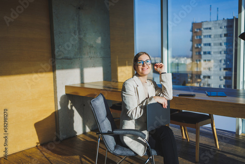 Smiling young businesswoman in casual clothes and glasses sitting in the office with a mobile phone while working on a remote project using a laptop