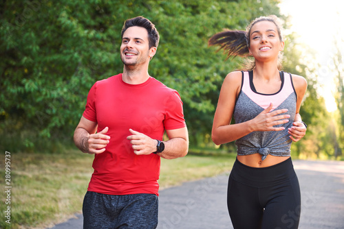 Smiling young couple running in the park