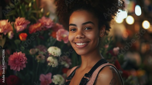 Smiling young female florist arranging vibrant flowers in a colorful flower shop