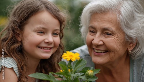 Smiling young girl and elderly woman leaning toward a yellow flower while enjoying time together in a garden full of greenery and vibrant blooms.