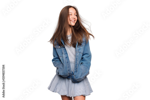 smiling young girl wearing denim jacket and skirt isolated on transparent white background