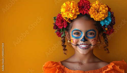Smiling young girl with traditional Dia de los Muertos sugar skull makeup and a vibrant flower crown on an orange background. Festive and joyful celebration.