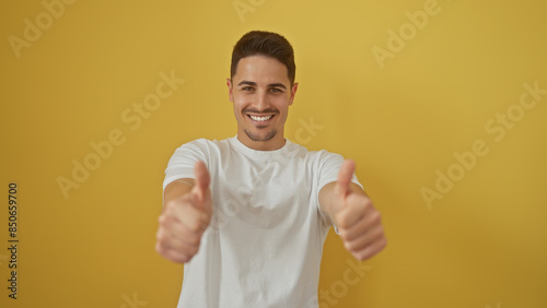 Smiling young hispanic man with beard giving thumbs up against a yellow background.