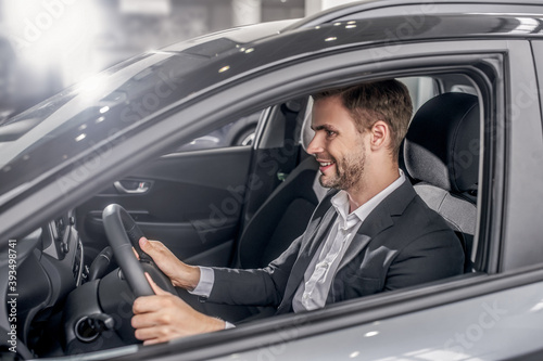 Smiling young male sitting in car, holding steering wheel