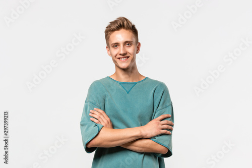 Smiling young man in a green tee holds hands folded isolated over grey background.
