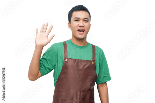 Smiling young man in green shirt and brown apron waving at the camera. Cheerful and friendly expression, perfect for service or hospitality setting........