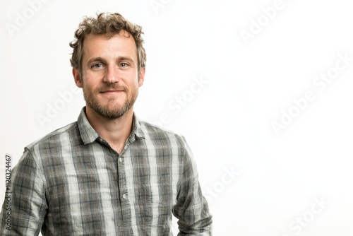Smiling Young Man in Plaid Shirt Against a Bright Background