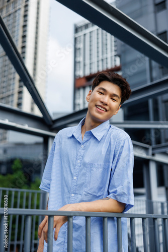 Smiling young man leaning on railing of bridge